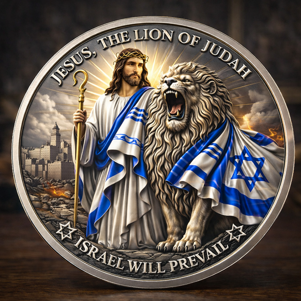 This stunning coin captures the powerful image of Jesus, crowned as the King of Kings, standing alongside the majestic Lion of Judah. The symbolism is profound—Jesus, the ultimate protector, and the Lion, representing strength and authority. Together, they convey an unstoppable force of divine leadership and unwavering protection for the people of Israel.
